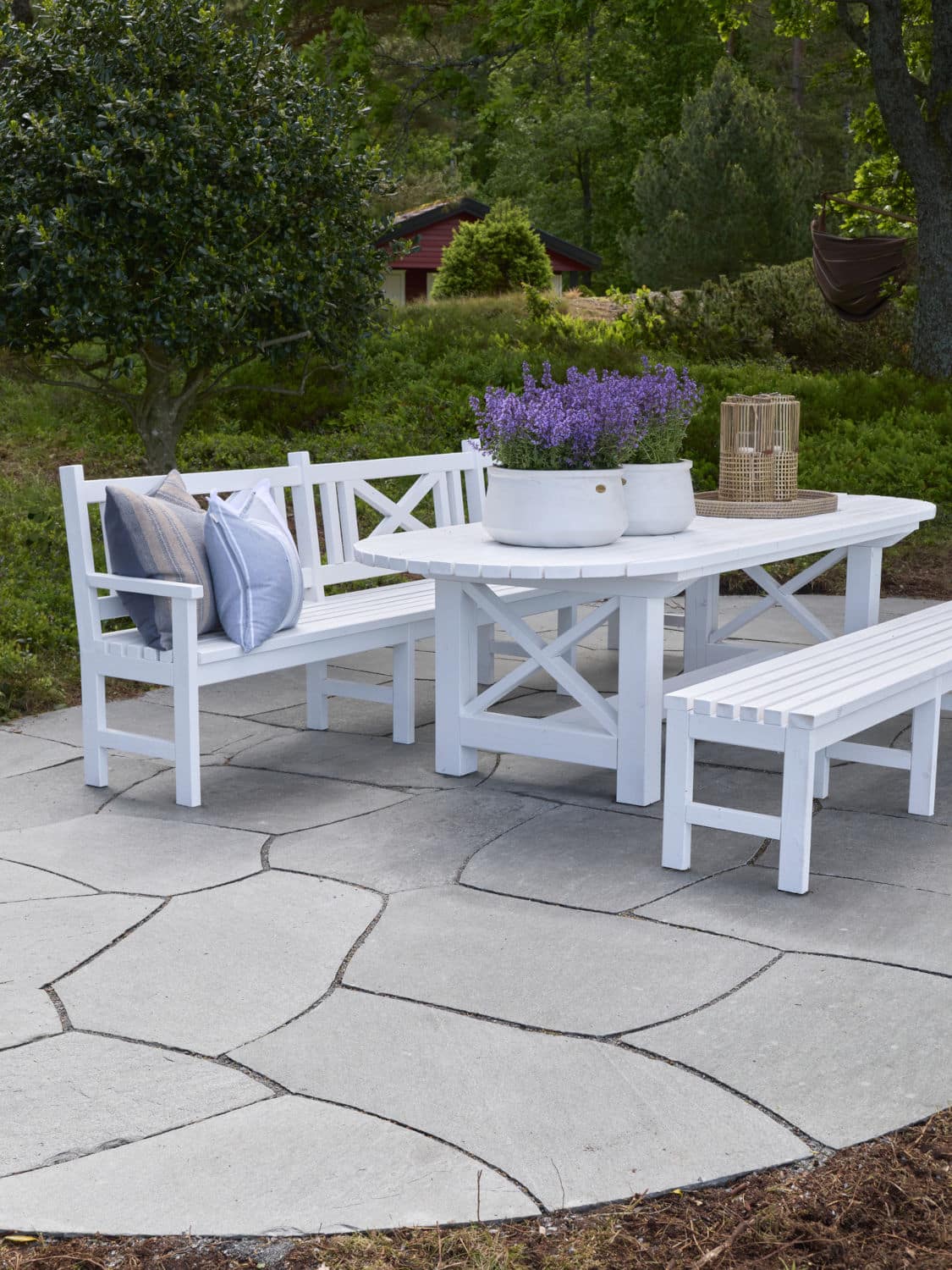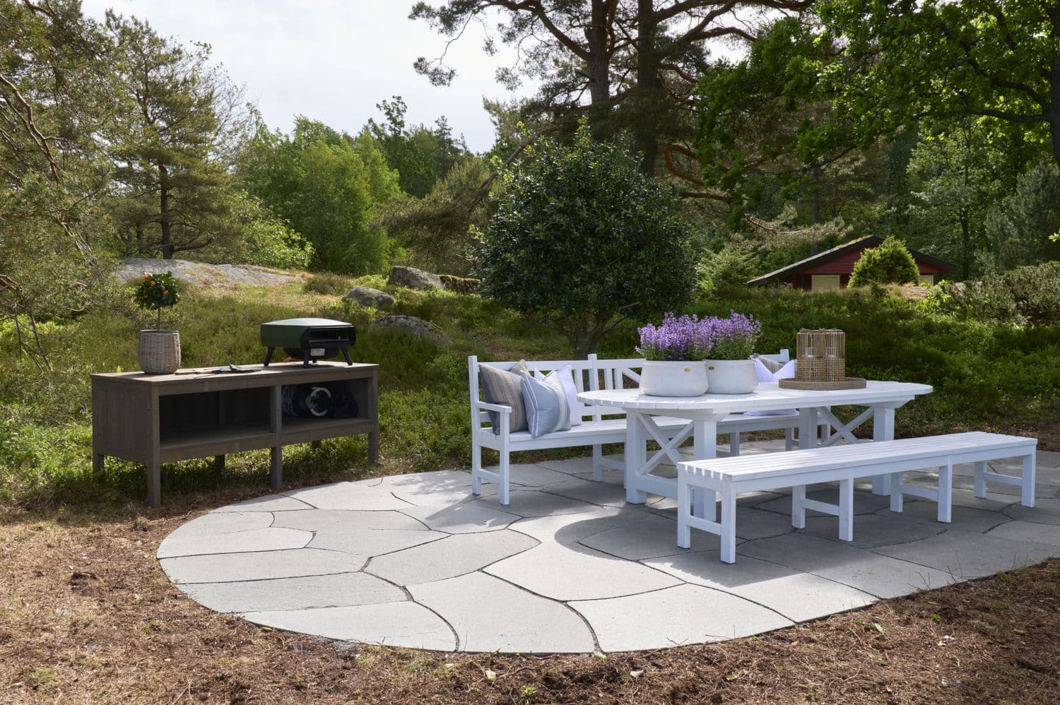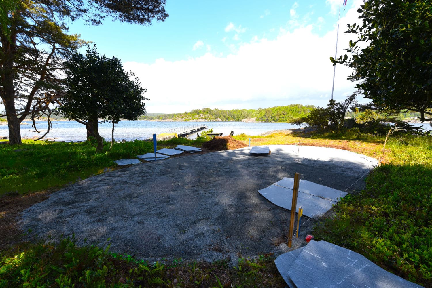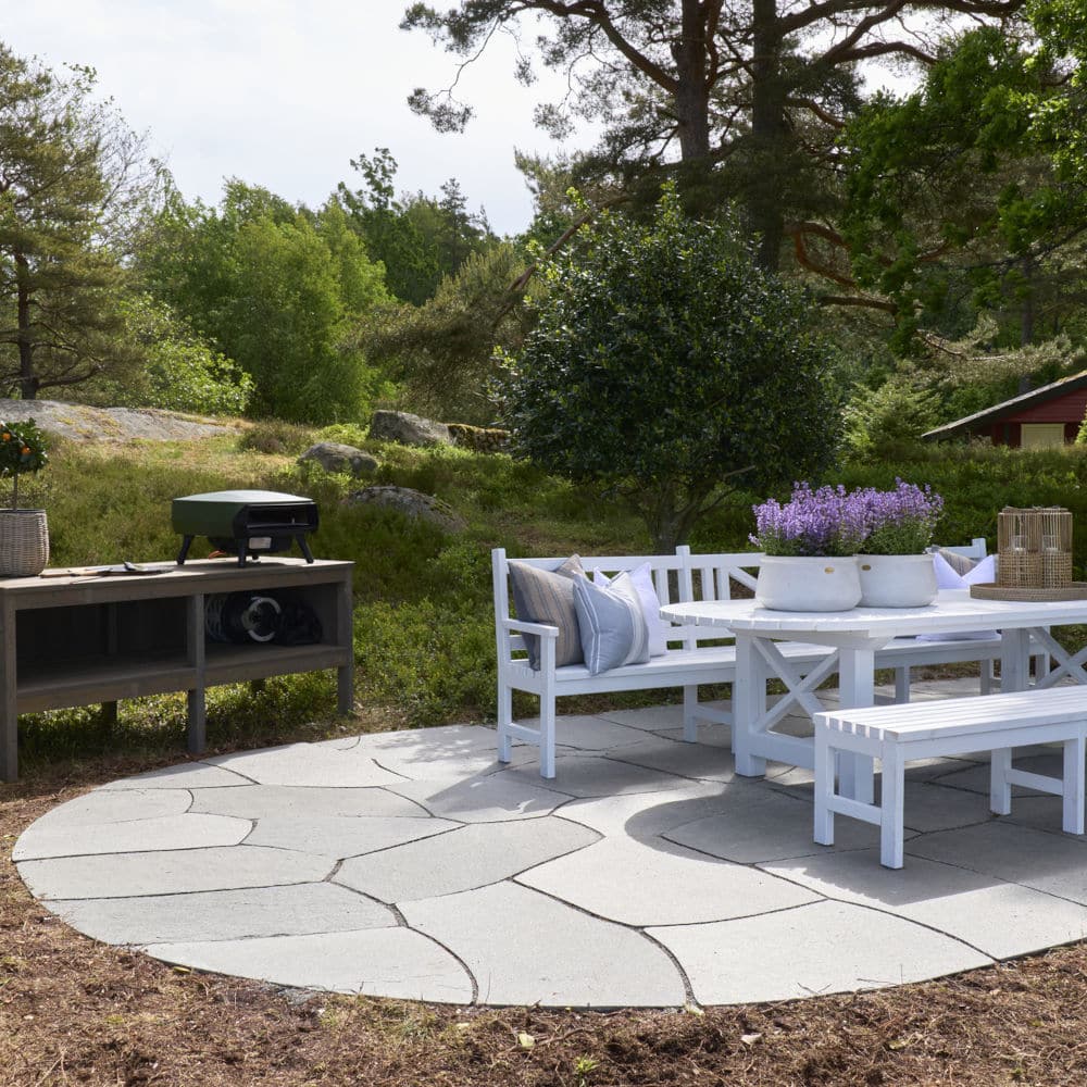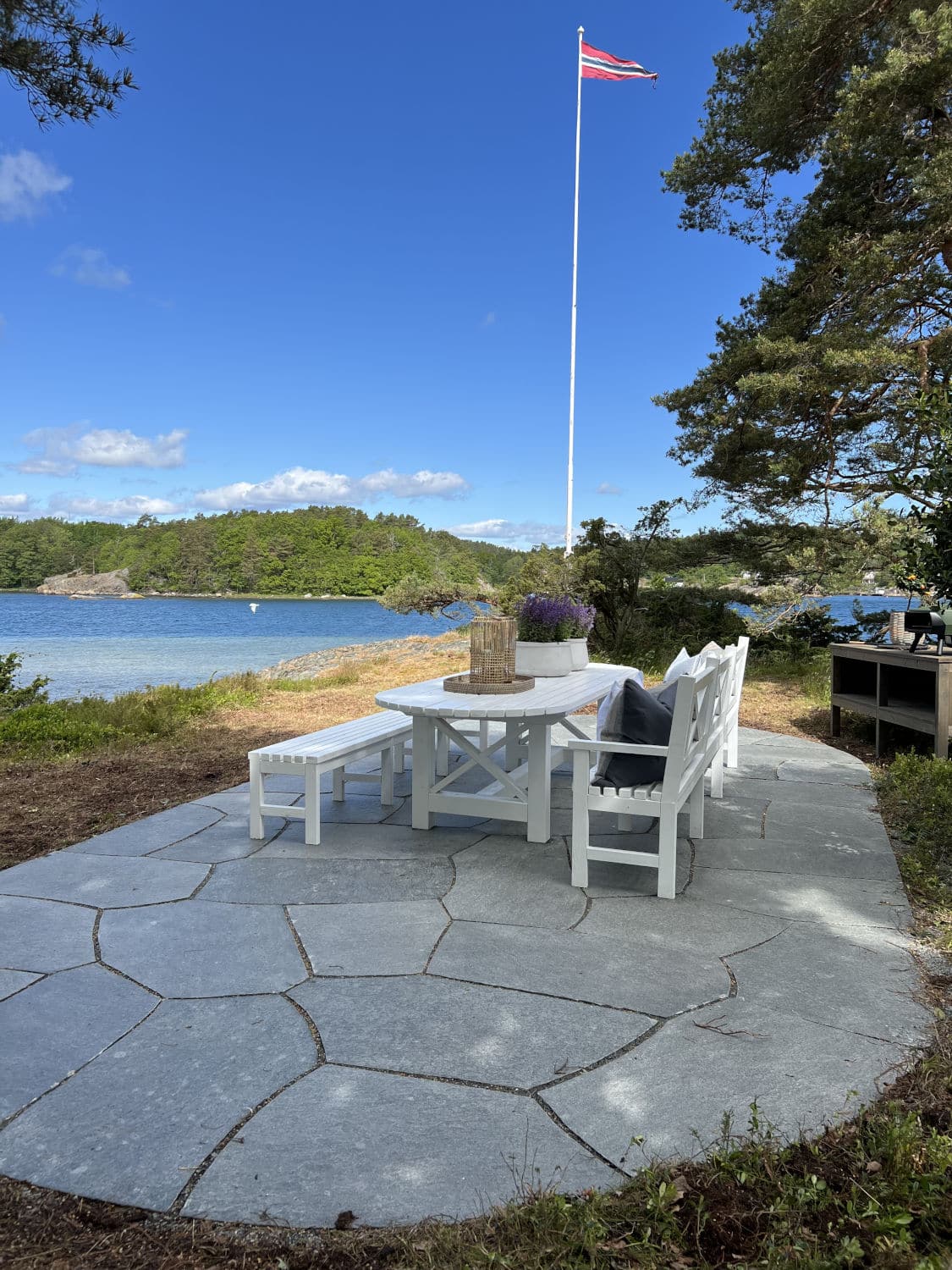 Utomhusområdet mot Tromøysundet och kvällssolen uppgraderades med Stoneart Oregelbunden Klassisk. Färdigställd med mörka Oppdal stora oregelbunden skiffer från vår partner Oppdal Sten AS.