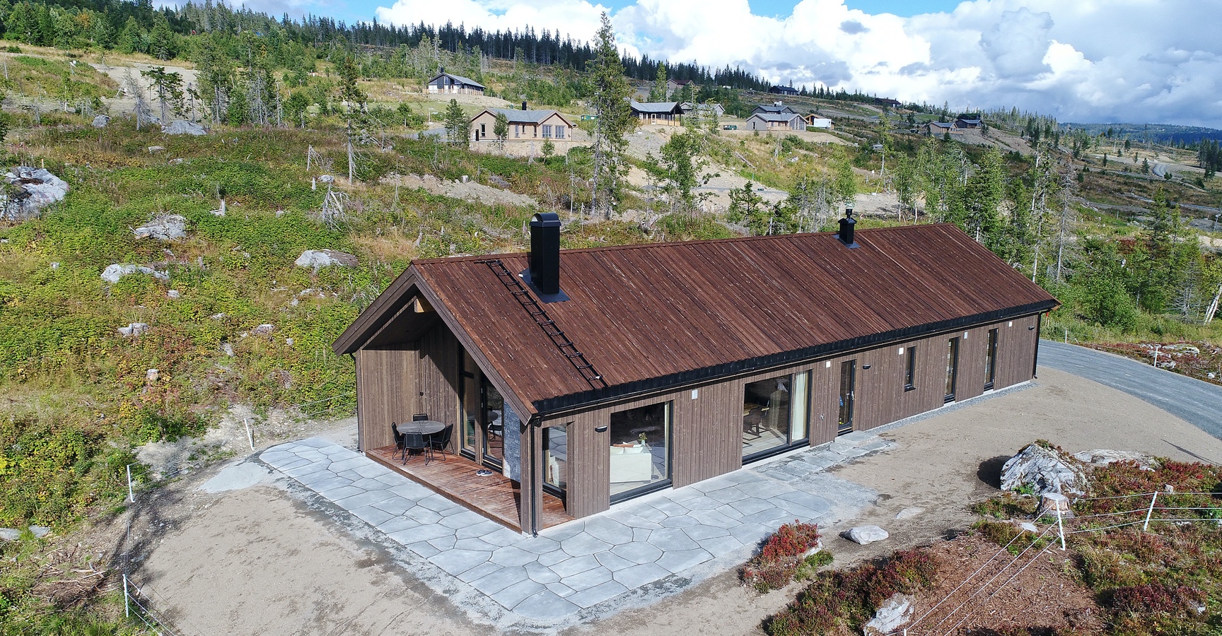 Johannes Høsflot Klæbo upptäckte Dovreskiffer då han besökte Jøra Bygg på Norsk Hyttesenter utanför Oslo. Framför deras utställningsstuga ligger skiffern som en förlängning av uteplats, och skapar dessutom en förbindelse mellan uteplats och ingångsområde. Johannes har nu fått byggt en ny, vacker stuga av Jøra Bygg AS på hans egna träningsparadis i Skei.