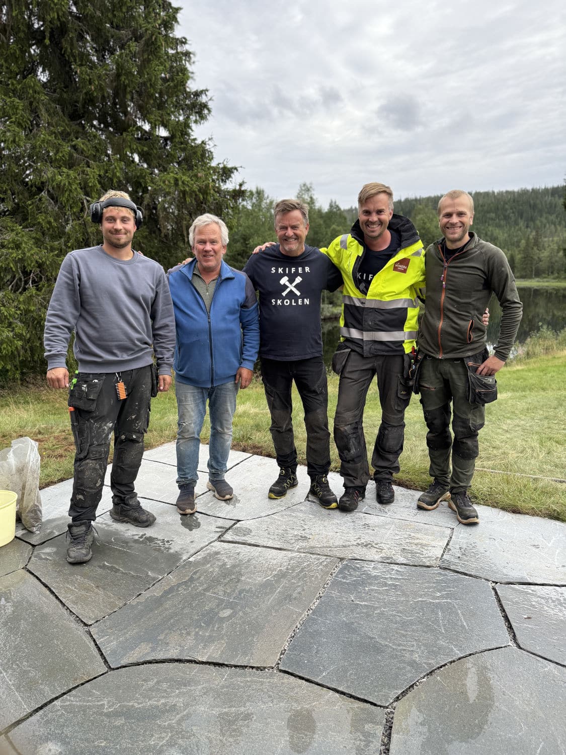 Halvor var tillbaka till gamla metoder när han återigen fick arbeta med Stoneart Oregelbunden – den här gången på Almoseteren i Snåsa. Med färdiganpassat Ljus Oppdal-skiffer från Minera Skifer blev uteplatsen både funktionell och vacker på rekordtid.