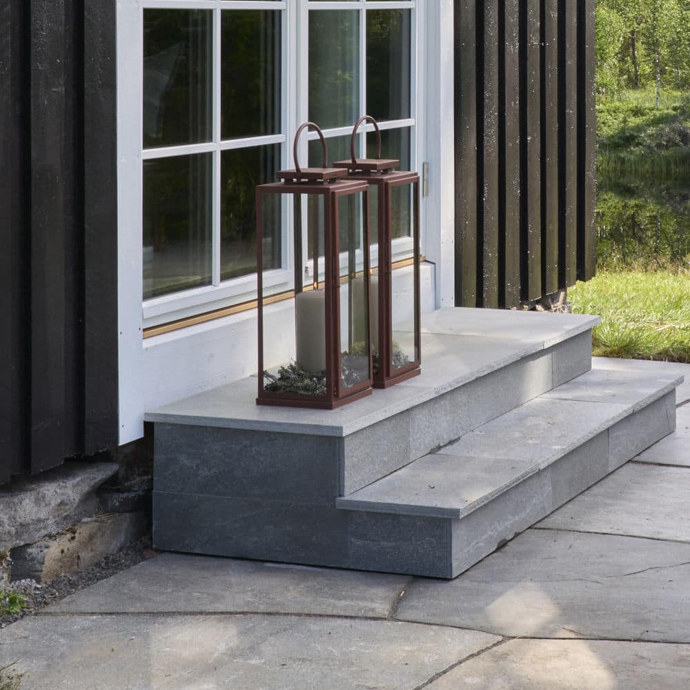 När den nya uteplatsen byggdes och stugväggen fick en ny öppning behövdes en gedigen och vacker koppling mellan inne och ute. Lösningen blev en färdig skiffertrappa från Stoneart i Lys Oppdal-skiffer – levererad specialtillverkad, numrerad och klar att monteras.