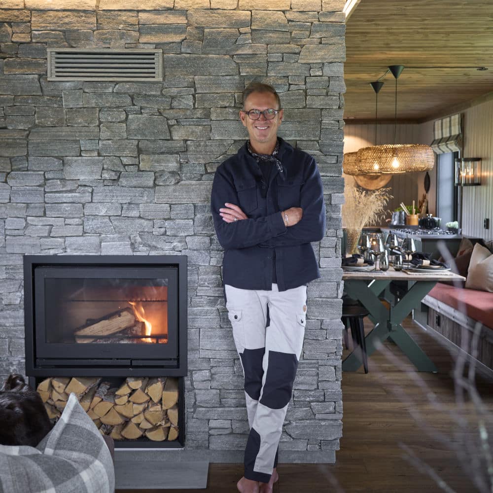 Inuti förvandlade Isak eldstaden med Stoneart Lifjell PROFF stenpanel – ett system av större stenar som ger intrycket av en riktig, handbyggd gipsskiva. Panelerna är enkla att installera och ger en gedigen, naturlig känsla som passar perfekt till stugans mysiga stil.